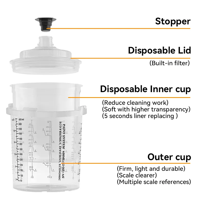 تتيح أكواب مسدس الرش التي يمكن التخلص منها AYSPAT تغييرات سريعة في اللون أثناء الطلاء ، مما يلغي اختلافات الألوان الناتجة عن بقايا الطلاء في أكواب معدنية تقليدية بسبب التنظيف غير المكتمل. إنه مناسب بشكل خاص لرش الدهانات الراقية مثل اللؤلؤ والدهانات المعدنية. يستخدم حاليًا على نطاق واسع في لوحة رذاذ السيارات الأصلية ، وإصلاح الجسم 4S متجر ، والرسم المخصص للمركبات المعدلة.
