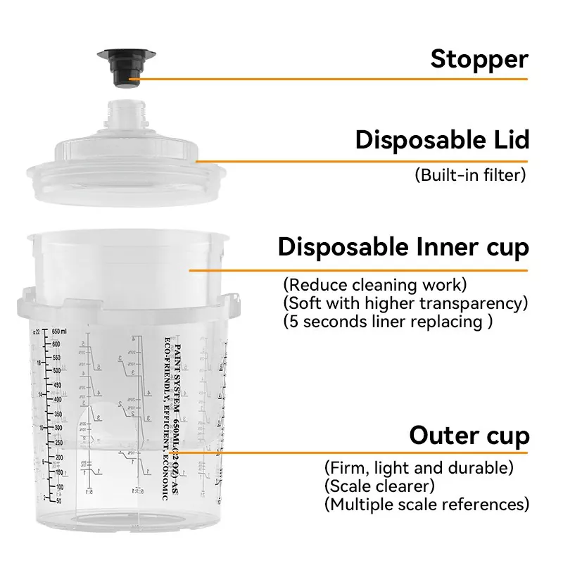 - تسمح لك النافذة المقطوعة في الكوب الصلب بمراقبة مستوى الطلاء بسهولة في أي وقت، ويمكن إزالة غطاء الكوب بسهولة عن طريق الإمساك بالبطانة من خلال جسم الكوب عند إعادة تعبئة الطلاء أو التلوين.