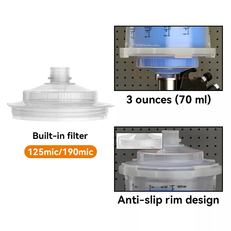 - يتميز غطاء كوب الرش القابل للتصرف AYS3.1 ببنية مزدوجة الطبقة تحمل ما يصل إلى 3 أونصات (70 مل) من الطلاء أسفل الفلتر. يعمل الغطاء على تحسين تدفق الطلاء واتساقه، مما يقلل من تناثر الطلاء.