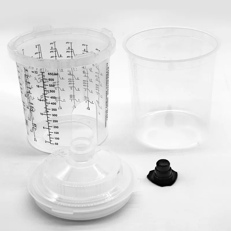 يتميز كوب مسدس الرش الذي يمكن التخلص منه 650 ملًا بتصميم متكامل على حافة الكأس الخارجية. يقفل الغطاء على الكوب الخارجي عن طريق التواء 1/4 بدوره في اتجاه عقارب الساعة ، مما يقلل من الوقت الذي يستغرقه تغيير الكوب الداخلي. هذا يجعلها مناسبة بشكل خاص للرش متعدد الألوان ، مما يؤدي إلى تحسين كفاءة تغيير لون الطلاء. كما يزيل التصميم بدون وظيفة إمكانية أن يصبح الكأس غير صالح للاستخدام بسبب طوق ضائع.